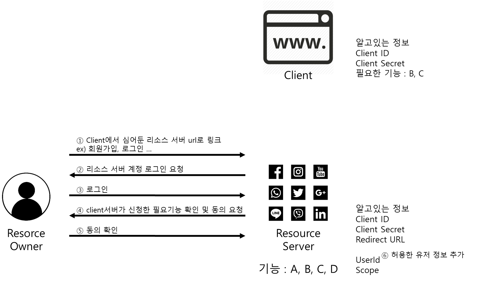 - 리소스 서버 링크 예시 : http://resource.server/?client_id=1&scope=B,C&redirect_uri=https://client/callback