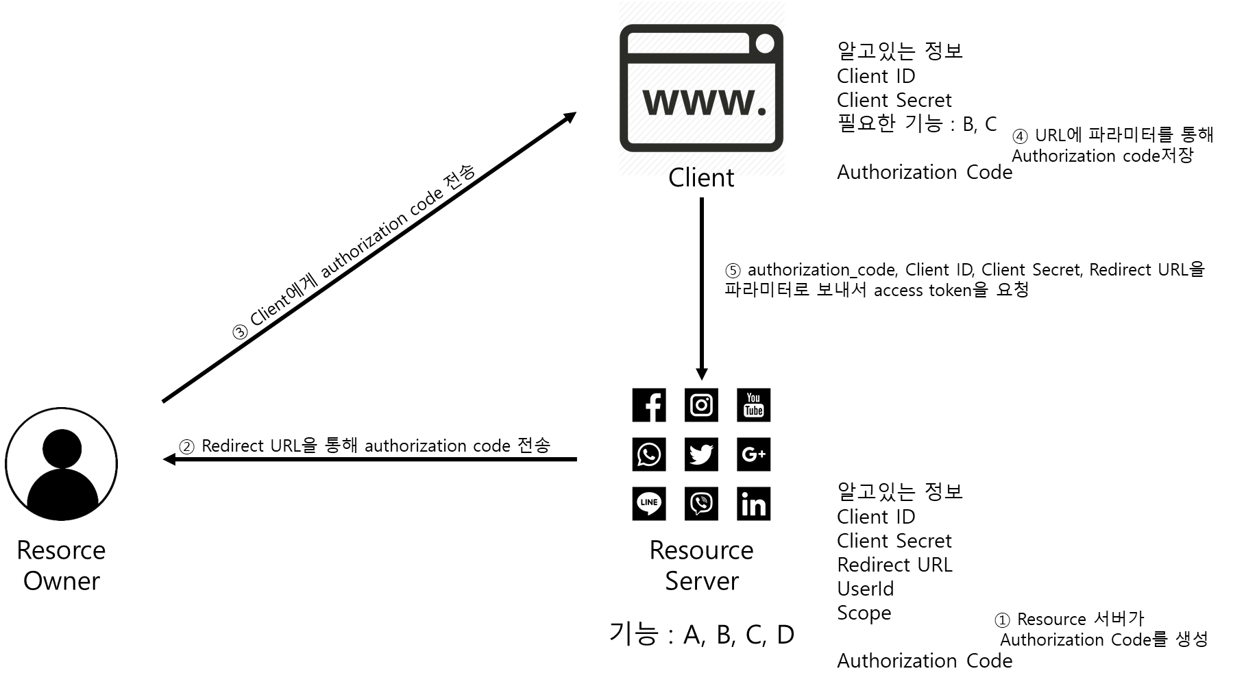 ※ 클라이언트가 리소스 서버를 이용하기 위해서는 리소스서버의 승인을 사전에 받아야 함