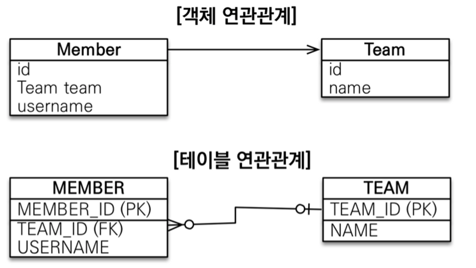 - 객체: Member → Team 은 member.getTeam()을 통해 가능, Team → Member 는 참조할 객체가 없기 때문에 불가능