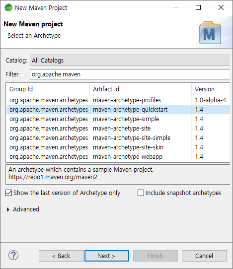 • Filter에 org.apache.maven 검색 > artifact Id : maven-archetype-quickstart 선택 > next 클릭
