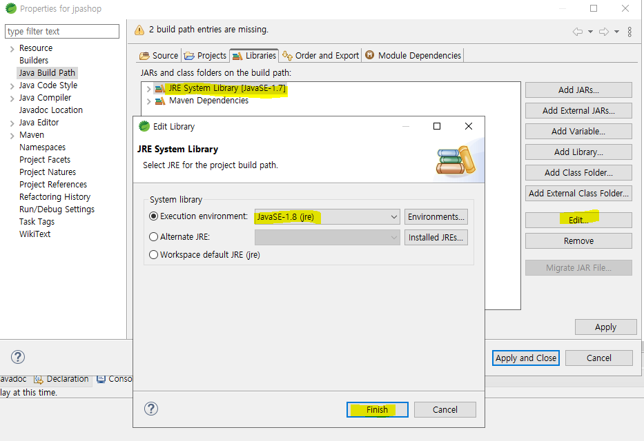 • 프로젝트 우클릭 > properties 클릭 > Java Bulid Path 선택 > JRE System Library [JavaSE-1.7] 선택 > Edit 선택 > JavaSE-1.8(jre) 변경 후 Finish