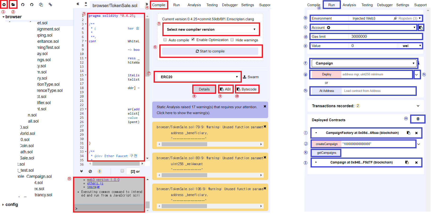 - ⓑ : .sol 파일을 실행 할 환경의 목록 (JavaScript VM, Injected Web3, Web3 Provider)