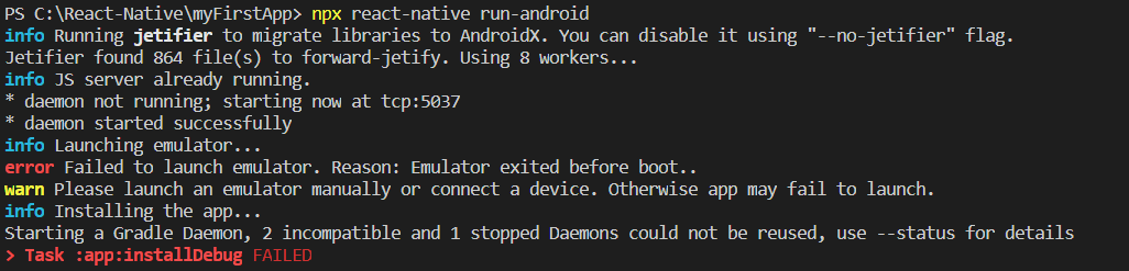 에러 메세지 : error Failed to launch emulator. Reason: Emulator exited before boot..