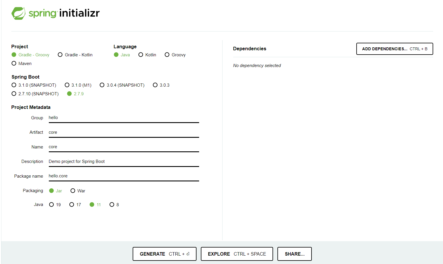 2. 스프링 부트 스타터 사이트에서 스프링 프로젝트 생성 (https://start.spring.io)