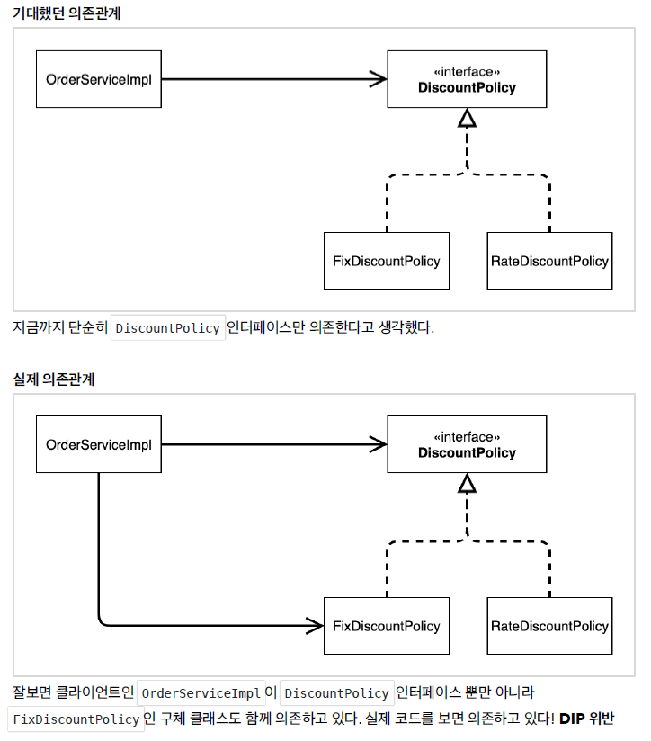 주문 서비스 클라이언트 OrderServiceImpl는 DiscountPolicy 인터페이스 뿐만 아니라 구현 클래스에도 의존함.