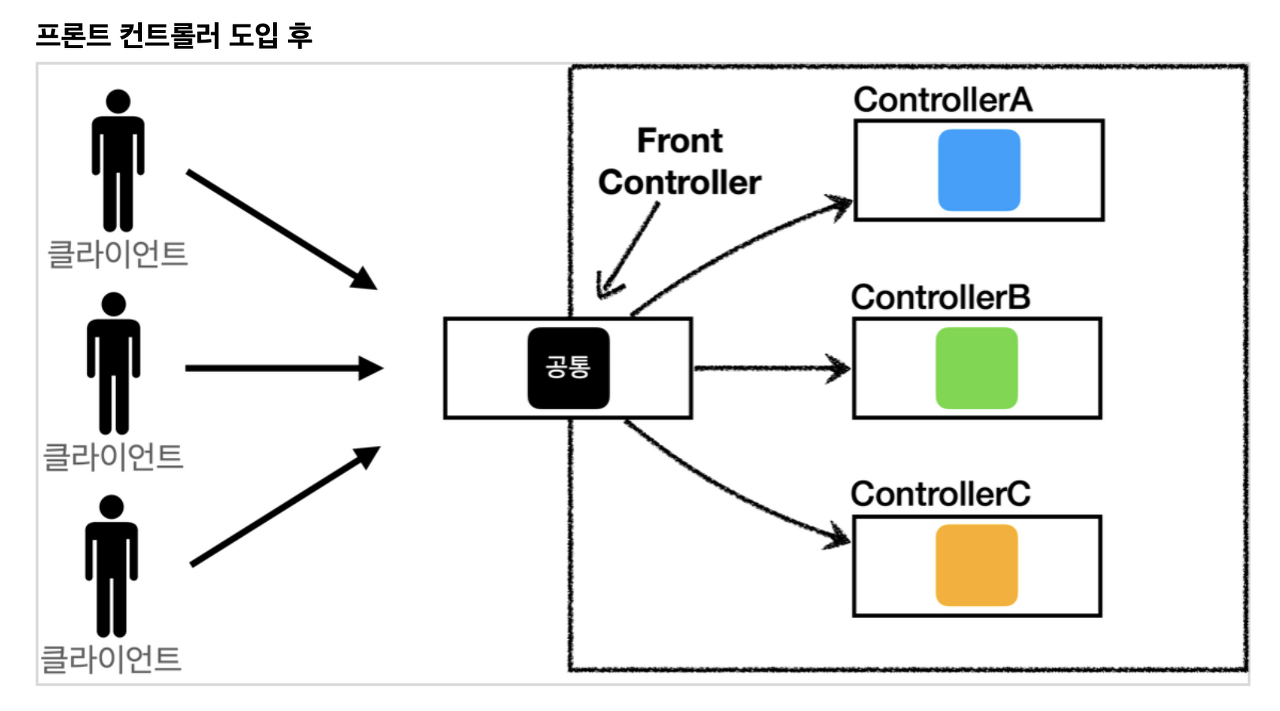 • 프론트 컨트롤러 서블릿 하나로 클라이언트의 요청을 받음